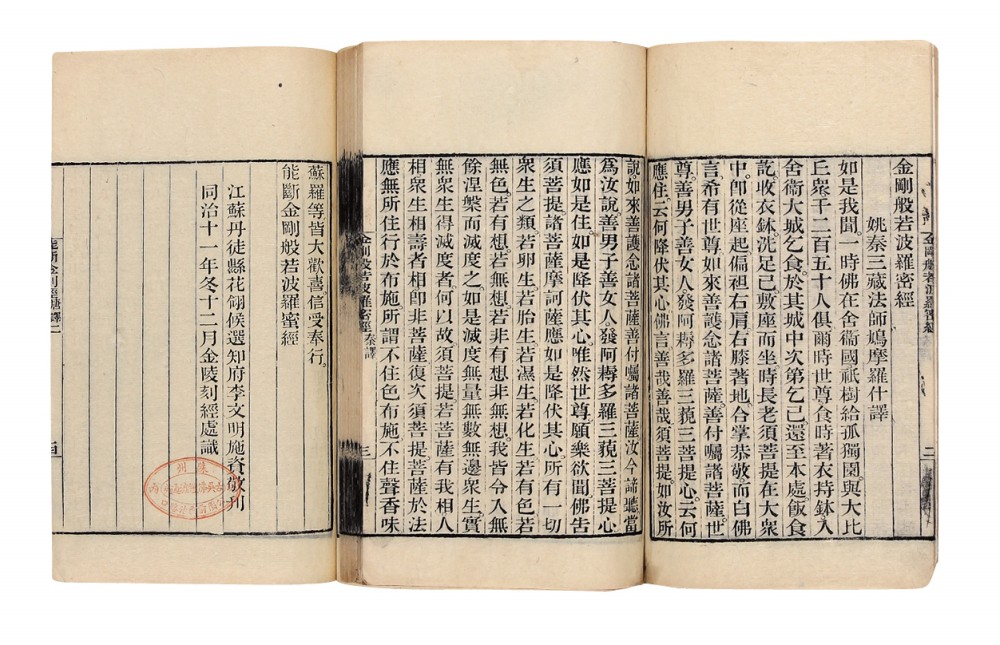 是书老装未衬,字形方整。《金刚般若波罗蜜经》是大乘佛教的重要经典。最早有秦鸠摩罗什译本,后相继出现了北魏菩提留支、南陈真谛、隋达摩笈多、唐玄奘以及义净译等五种译本,拍品即将历代六种译本合为一册刊版行世。