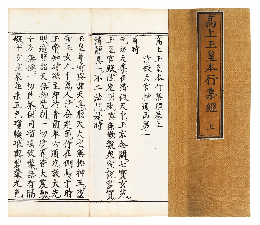 提 要: 是书原装原函原签,用白棉纸精印,纸质坚实,写刻隽秀。拍品接缝处镌有刻工名,如靳、许、靳洪刻、牛、胡山、二赵、三赵等。尤为难得的是拍品还保有了原明代内府经卷的装潢形式,函套、封面用上等黄绫装饰,题签亦为黄绫刷印,装帧考究,品相极佳。经首刊有玉帝说法图,经末尾刊有二郎神君图像,绘製细腻,线条流畅,刻印俱精,经文中亦刊有八宝图案,书中文字行楷书手写上板,笔划舒展,刊刻颇精。此经为道教经典,述元始天尊在清微天宣讲玉帝登仙之事,为道家常读常诵的经典。