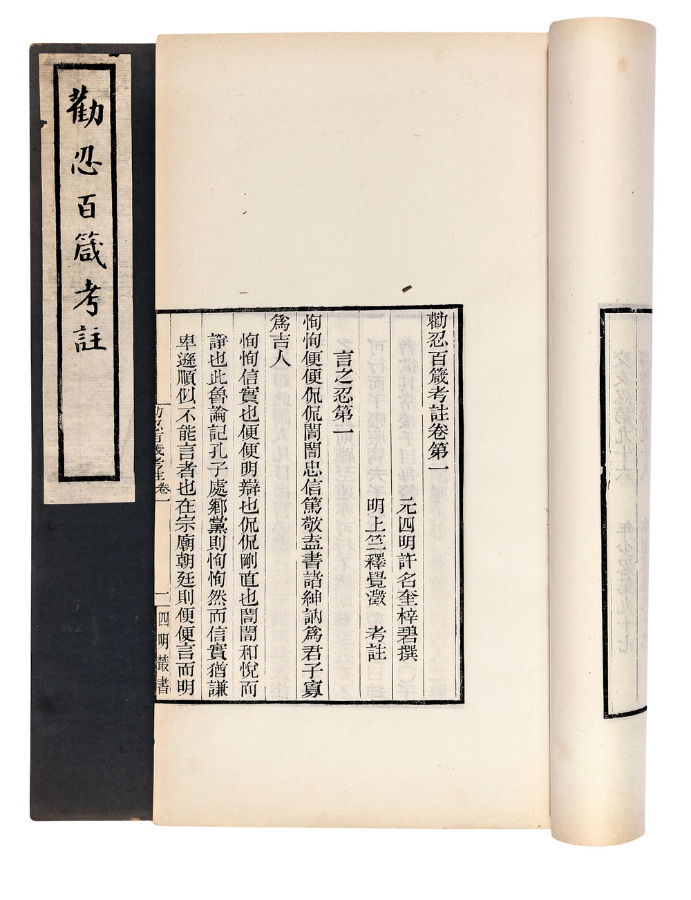 是书为白纸精刻本,原签俱存,天头地脚阔大悦目,版心小巧,字体镌刻精工,版心下方镌“四明丛书”字样。此为张寿镛辑《四明丛书》之零种,专述为人之本,论百事忍为先之理,其说道极具说服力,对今人亦颇具意义。