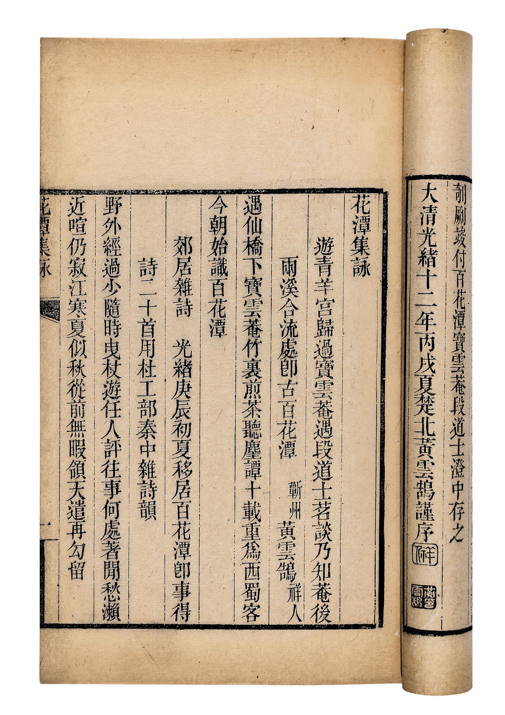 提 要: 是书为诗人黄云鹄及其友人咏唱成都名胜——百花潭的诗集,刻印较佳。黄云鹄(1819-1898),黄侃之父,湖北蕲春县人,咸丰三年进士,官至四川盐茶道,清廷二品大员。为官清廉正直,执法严谨,不畏强暴,被世人誉为“黄青天”。一生著述甚丰,有多部著作传世。著有《归田诗钞》《清画家诗史》《益州书画录续篇》等。