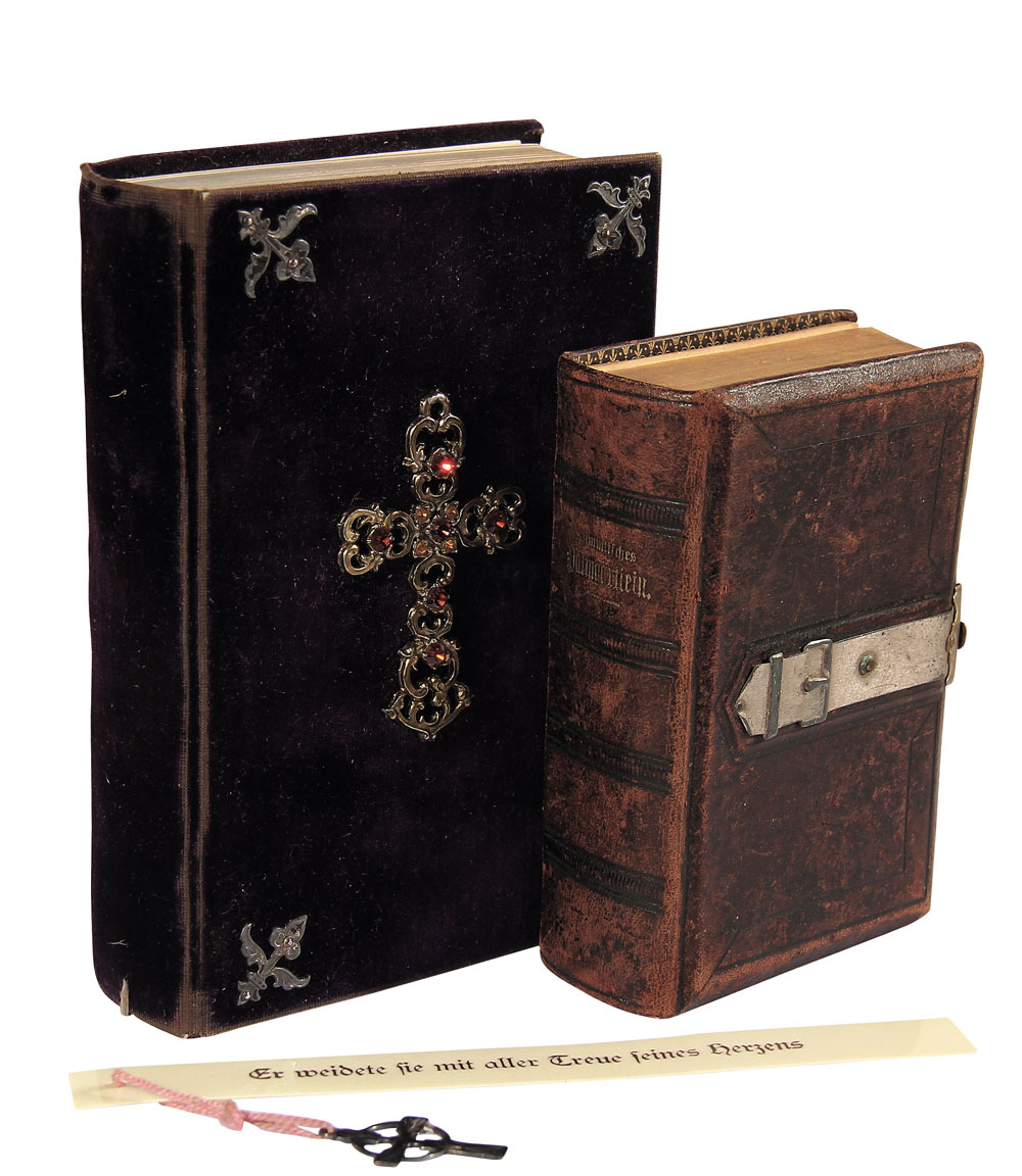 拍品为精装德文《圣经》二册。一册为紫色绒面,封皮带镶宝石十字架,并附精美书签;另一册带有金属书扣;开本小巧,装帧精美。