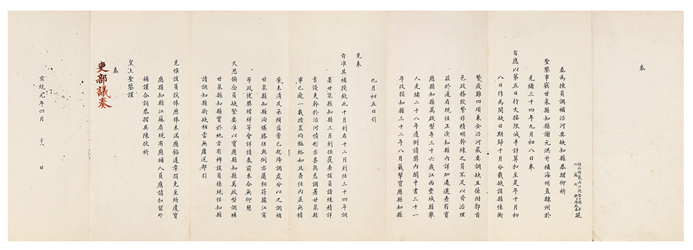 此为两江总督端方和江苏巡抚陈启泰的奏事折,谈及将宝应知县万启型调补到甘泉任知县,末有硃笔“吏部议奏”批语。
