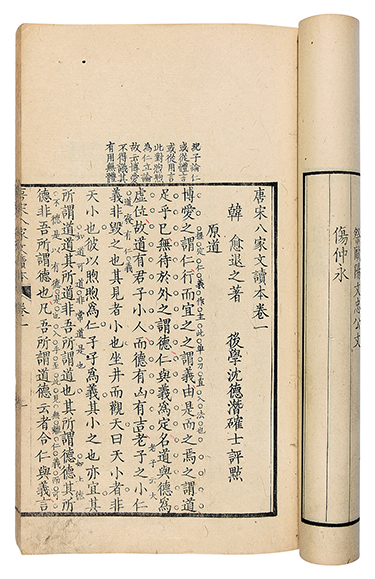 是书首有乾隆十五年沈德潜序,通篇写刻,皮纸精印。此书为初学读本,内收韩愈、柳宗元、欧阳修、苏洵、苏轼、苏辙、曾巩、王安石八家之文,并择选前人评点,考诸史传文籍录为总评,读者可两相印证。
