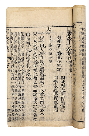 是书内收《大学》三卷、《中庸》四卷、《论语》二十卷、《孟子》十四卷,版心下镌“宝旭斋”。经查《中国古籍善本书目》,公藏仅一家。拍品疑似缺《诸儒讲义及管见》一卷。著录:《中国古籍善本书目》P135