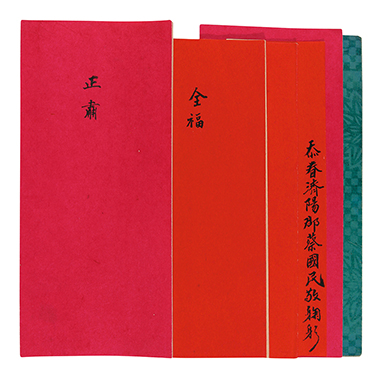 拍品为各色贺帖,上题“全福”、“忝春济阳郡蔡国民敬鞠躬”、“正肃”、“忝眷始平冯榮昌敬鞠躬”等字样。济阳、始平属今河南、湖北地区。